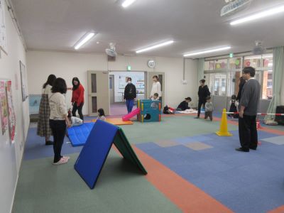元気いっぱいに、サーキットに取り組むこどもたちの様子です。何度も何度も繰り返し体を上手につかってお母さんと一緒に楽しんでいました。