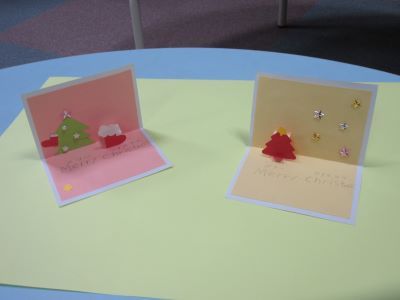 ふれあい工作「クリスマスカード作り」の第2弾では、飛び出すしかけのあるクリスマスカードです。何を飛び出すようにするかは、こどもたちが自分で考えて製作します。オリジナルの素敵なカードができました。
